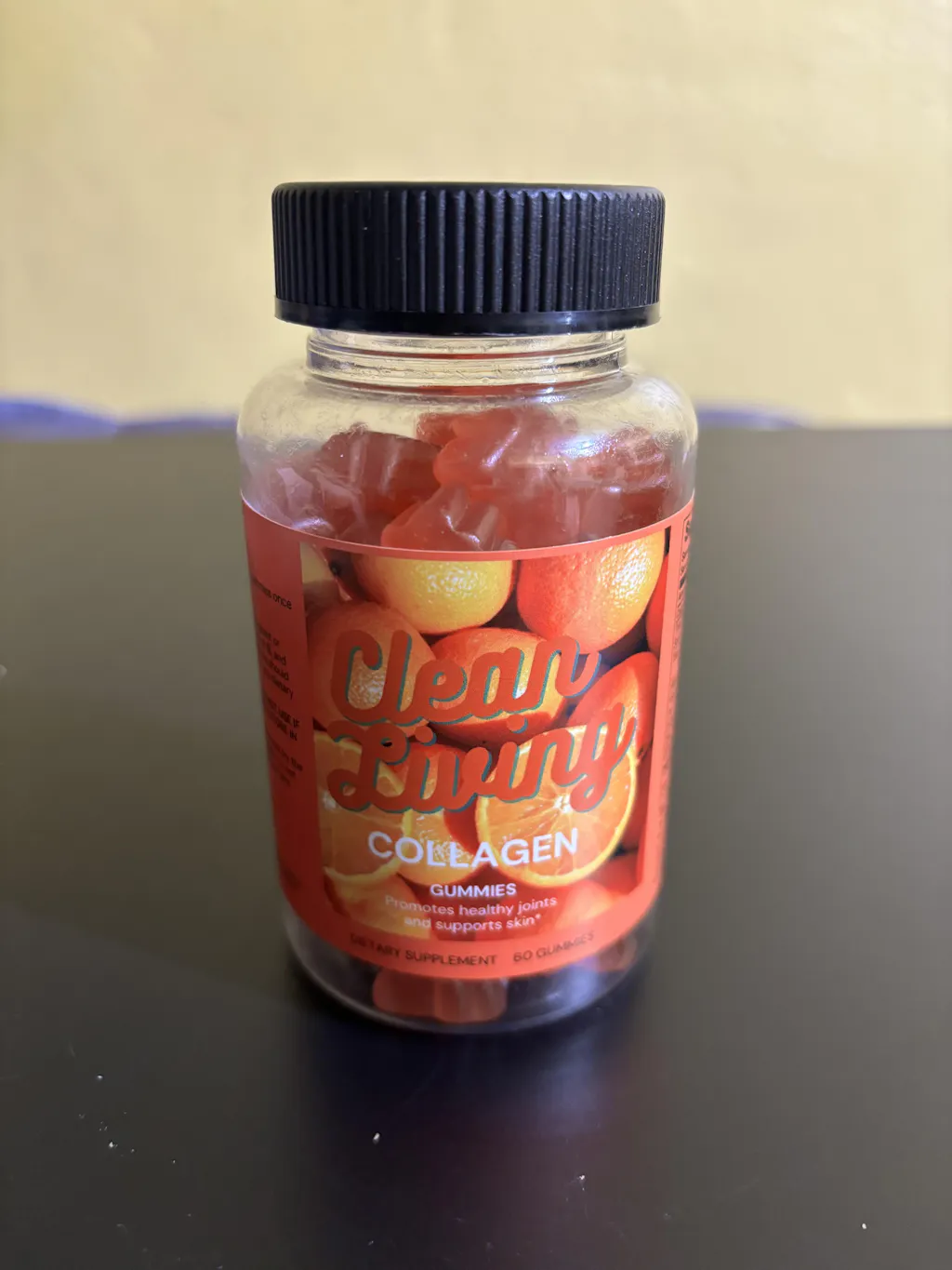 Ingredients: Vitamin A (as retinyl acetate), Vitamin C (as ascorbic acid), Vitamin D (as cholecalciferol), Vitamin E (as dl-Alpha tocopheryl acetate), Vitamin B-6 (as pyridoxine HCI), Folate, Vitamin B-12 (as cyanocobalamin), Biotin, Pantothenic Acid (as calcium d-pantothenate), Iodine (as potassium iodide), Zinc (as zinc citrate), PABA (para-Aminobenzoic Acid), Collagen (piscine), Silicon, Glucose syrup, Sugar, Glucose, Pectin, Citric acid, Sodium citrate, Passion fruit flavor, Vegetable oil (contains carnauba wax), Purple carrot juice concentrate.